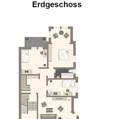 - Außenflächen: Balkone im Erd- und Obergeschoss, eine sonnige Terrasse sowie ein gepflegter Garten