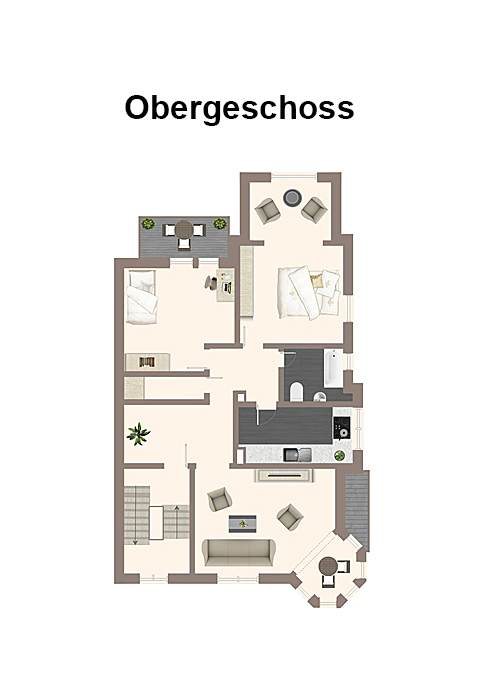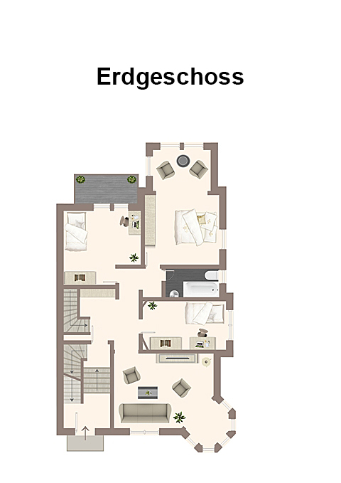 - Außenflächen: Balkone im Erd- und Obergeschoss, eine sonnige Terrasse sowie ein gepflegter Garten