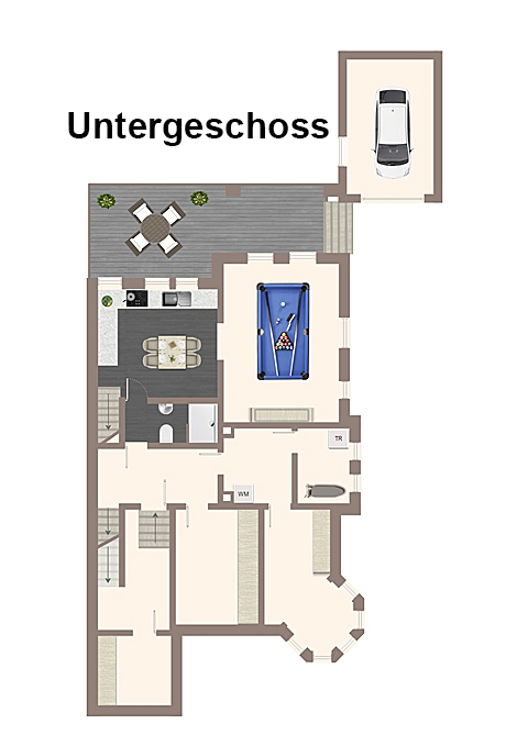 - Zusatzräume: Großzügiger Hobbyraum, vier Abstellräume und eine separate Waschküche